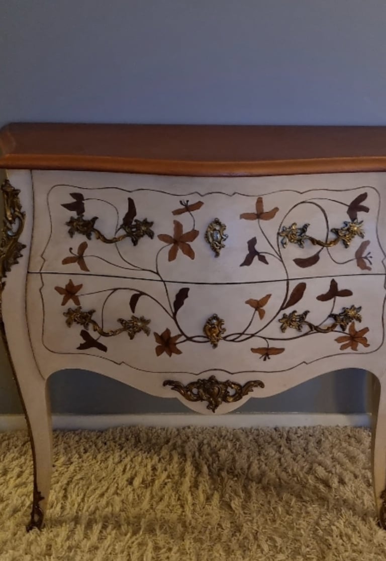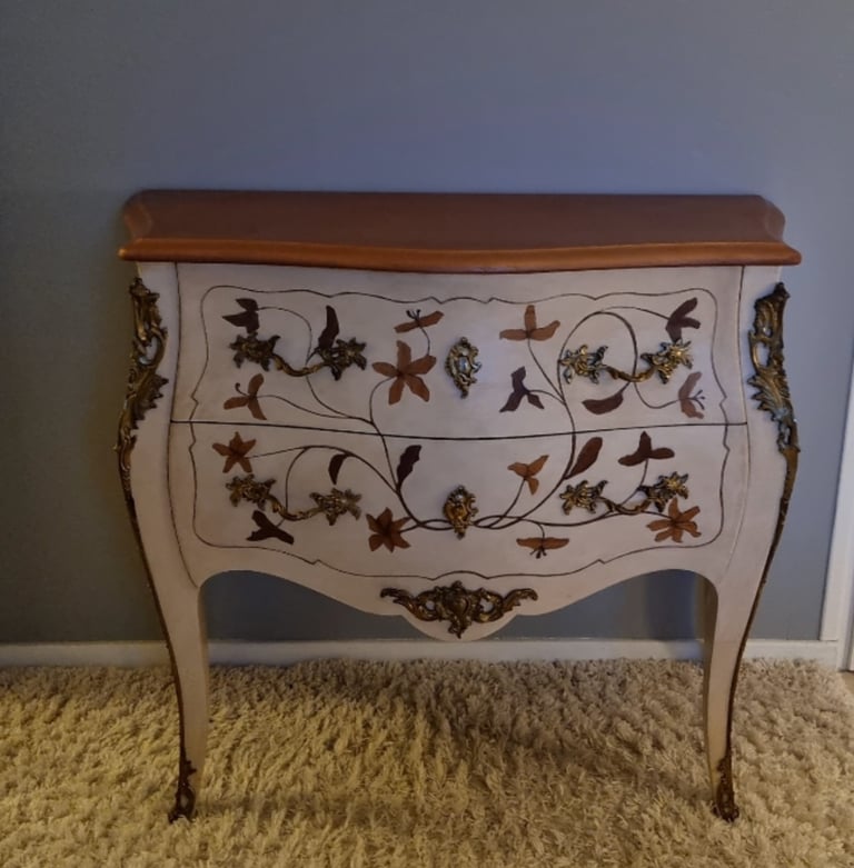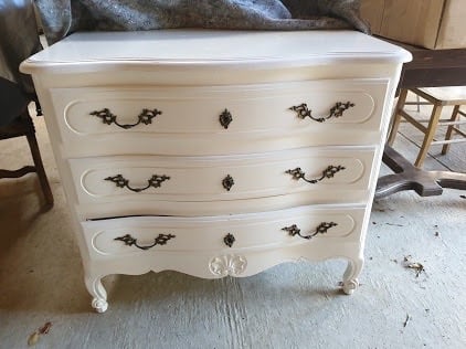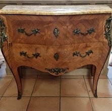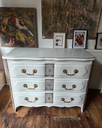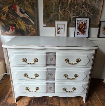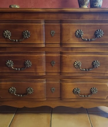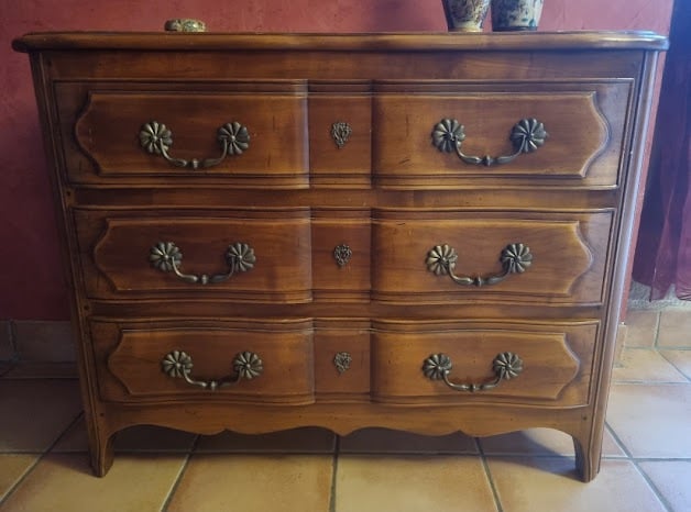 Commode style Louis XV rajeunie par une patine ombre naturelle, réchampis en peinture ton or