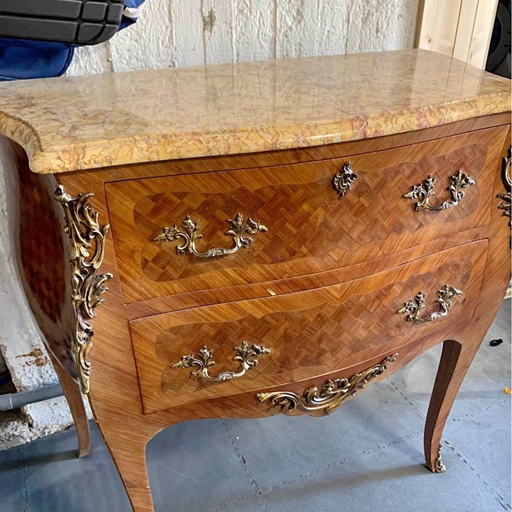 Commode, restauration et lissage du placage abimé, ton noir et or. Le marbre a été peint en noir mate et patiné en teinte or
