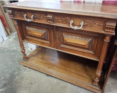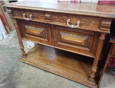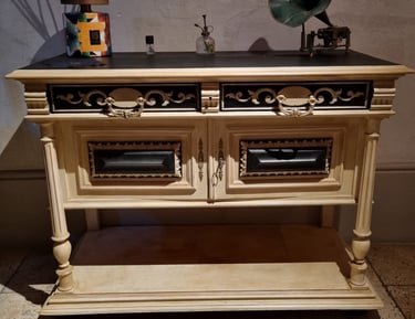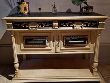 Console style Henri II relooké 2teintes crème et noir mate. Patine terre ombre naturelle noir