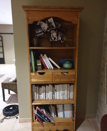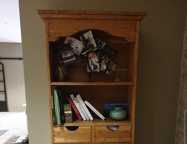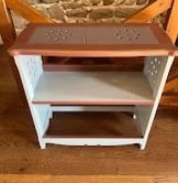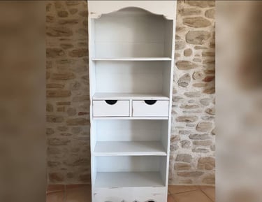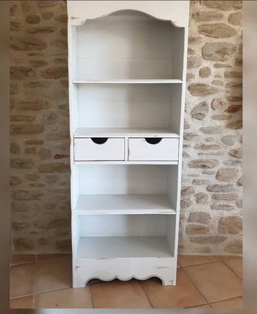 Bibliothèque en pin teinte en ton crème et réchampis gris