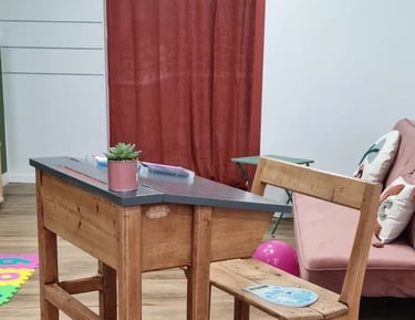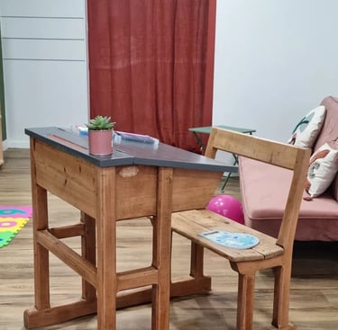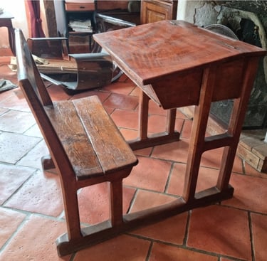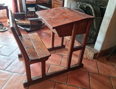 Vieux bureau d'écolier peint en gris bleu et terracotta pour les décors au nom d'une boutique de chaussures et vernis en ton naturel pour le reste