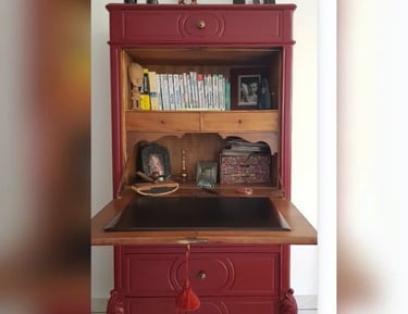 Secrétaire peint en rouge basque laqué, le sous-mains abimé a été restauré et peint en noir