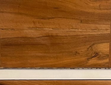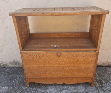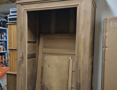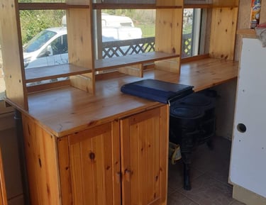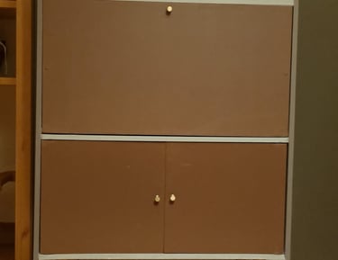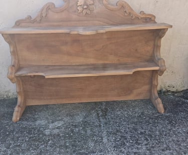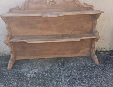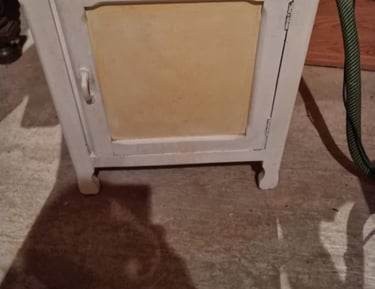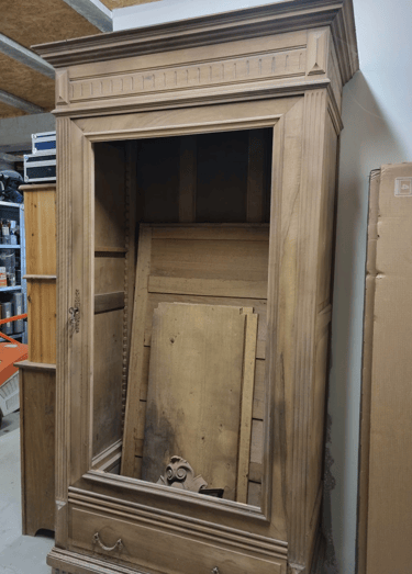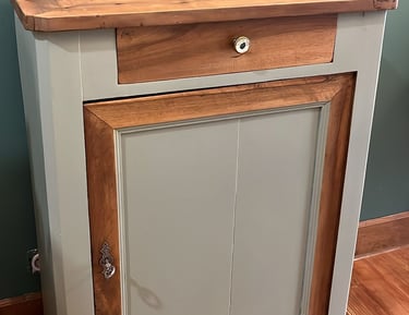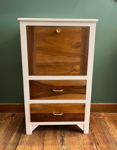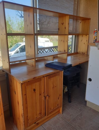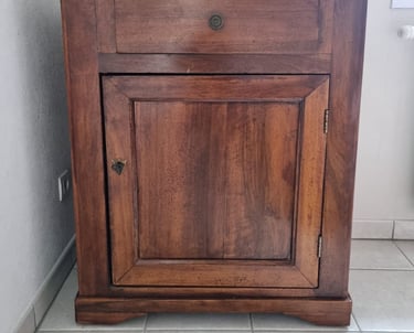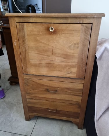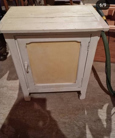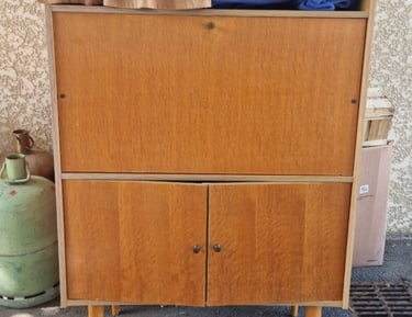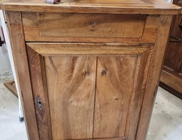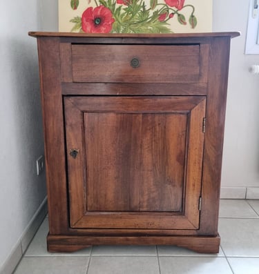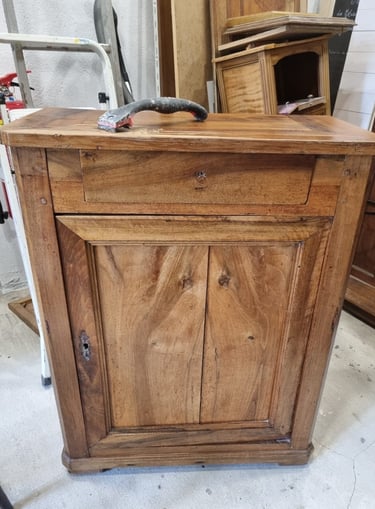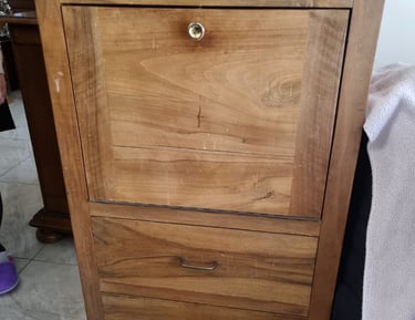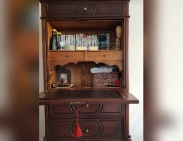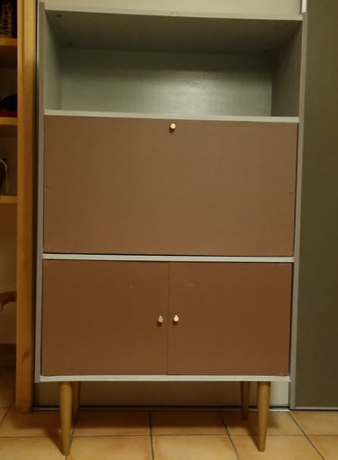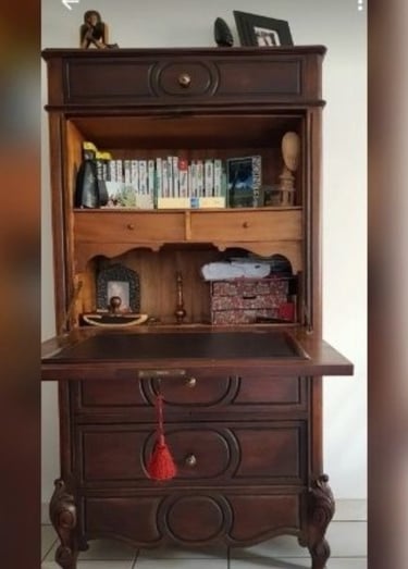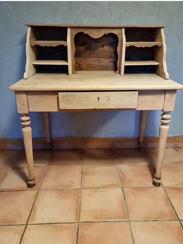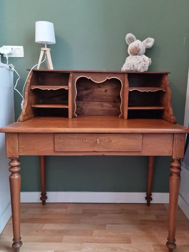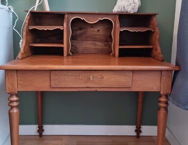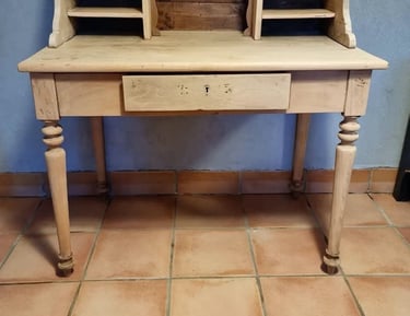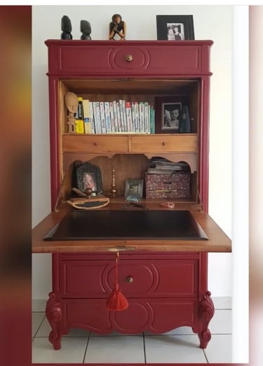 Avant après pour ce petit secrétaire. Le plateau très abimé a été peint en ton crème ainsi que l'ensemble. La porte et les deux tiroirs laissés en ton naturel magnifié par un vernis ton mate