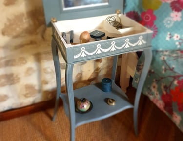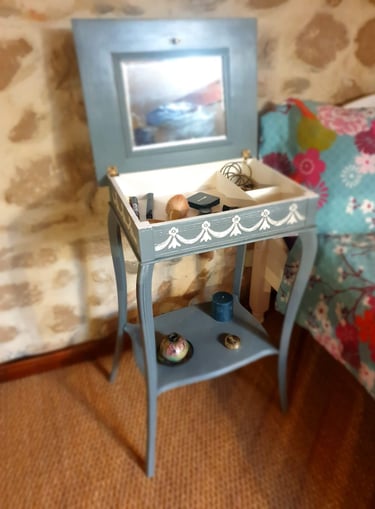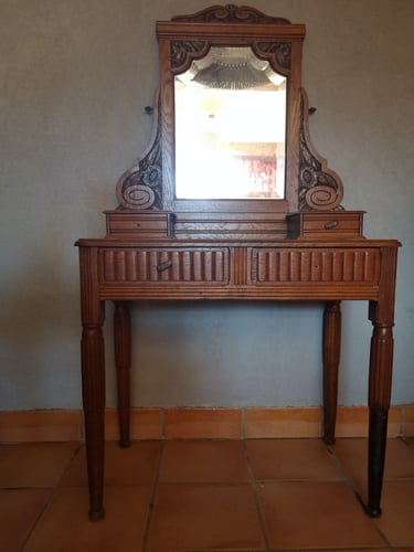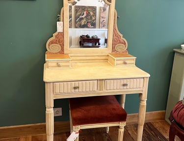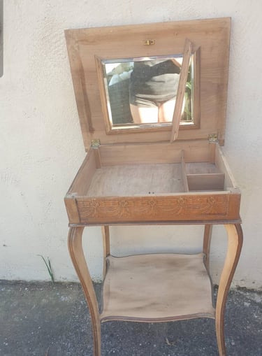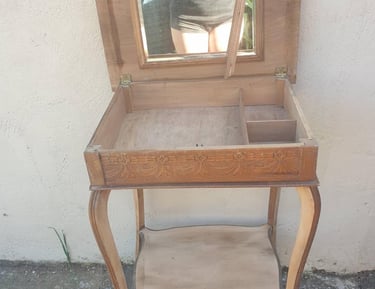 Coiffeuse années 30 peinte en crème, patinée ombre naturelle, les côtés ont été patinés en ton cuivrés