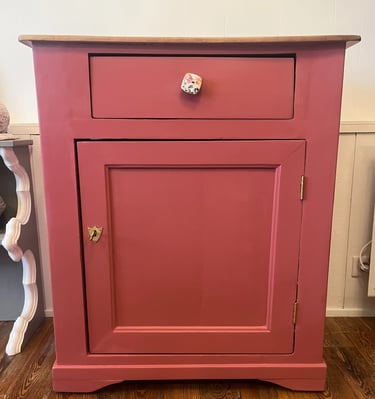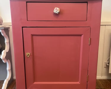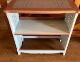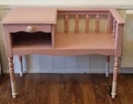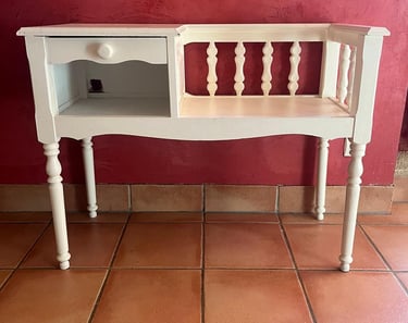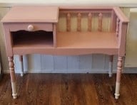 Ancien meuble téléphone peint en rose poudré et réchampis blancs sur les pieds