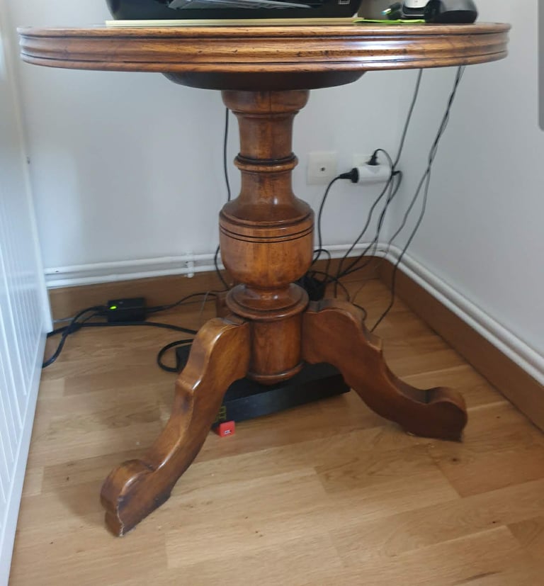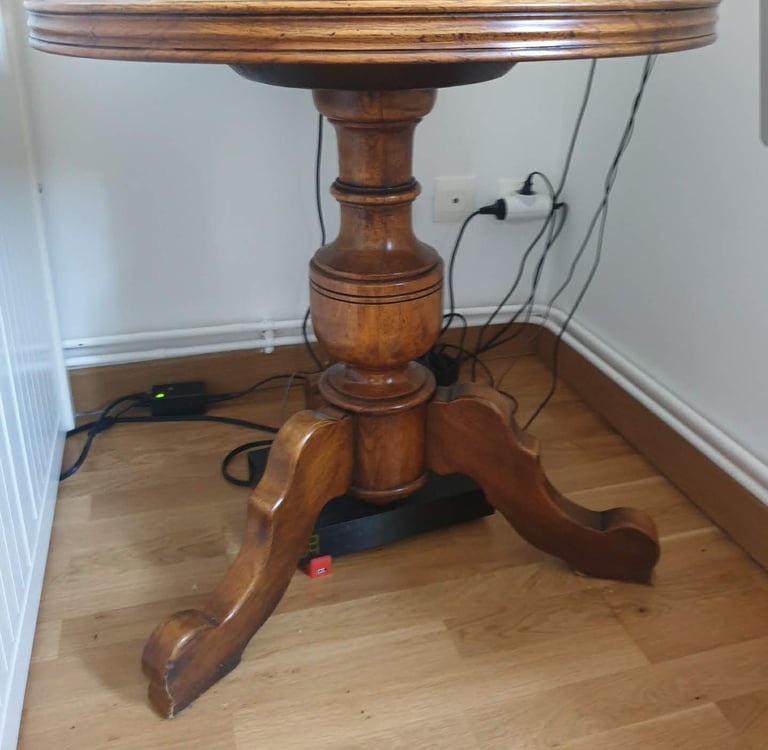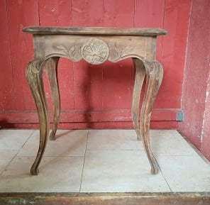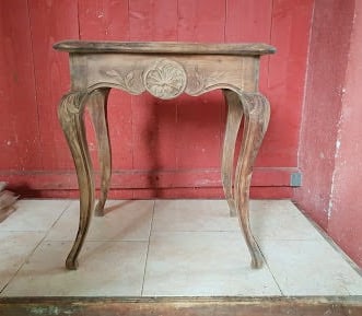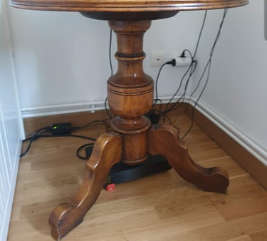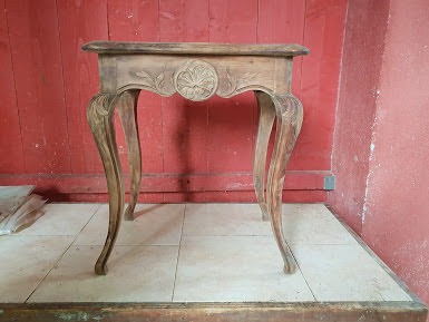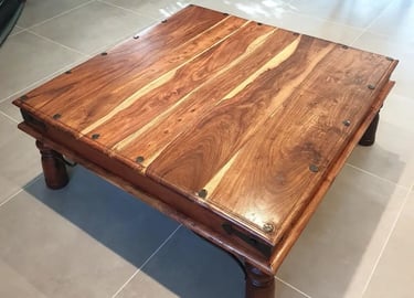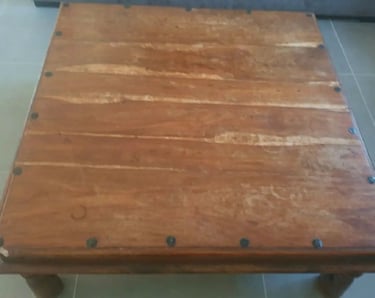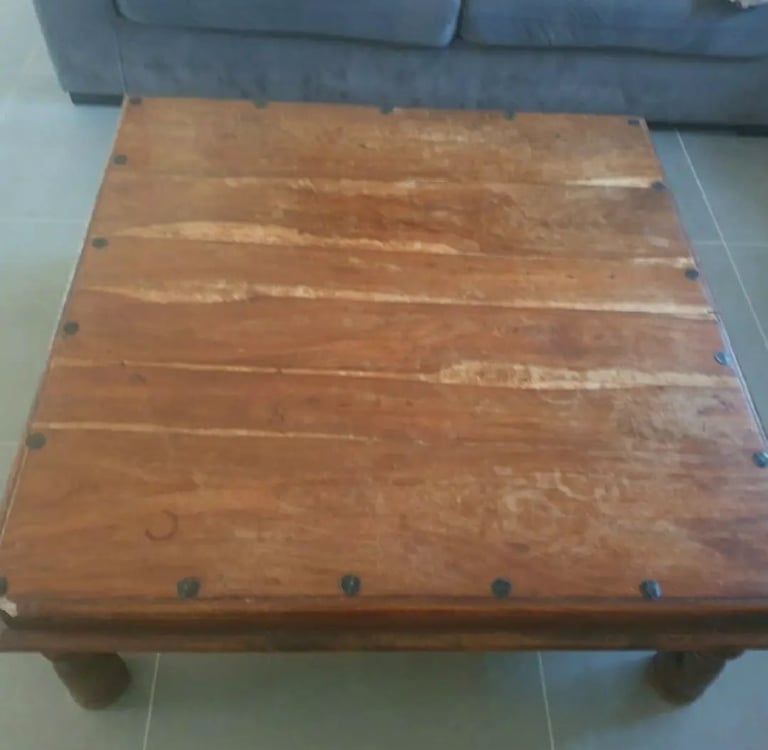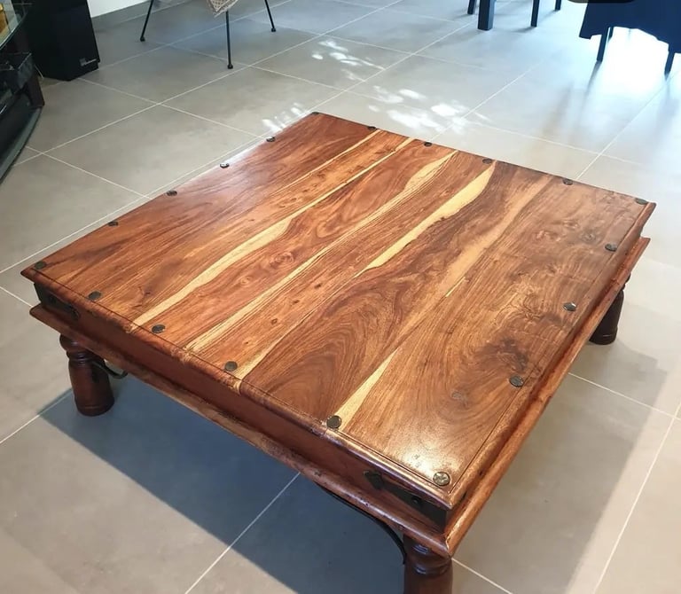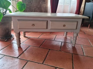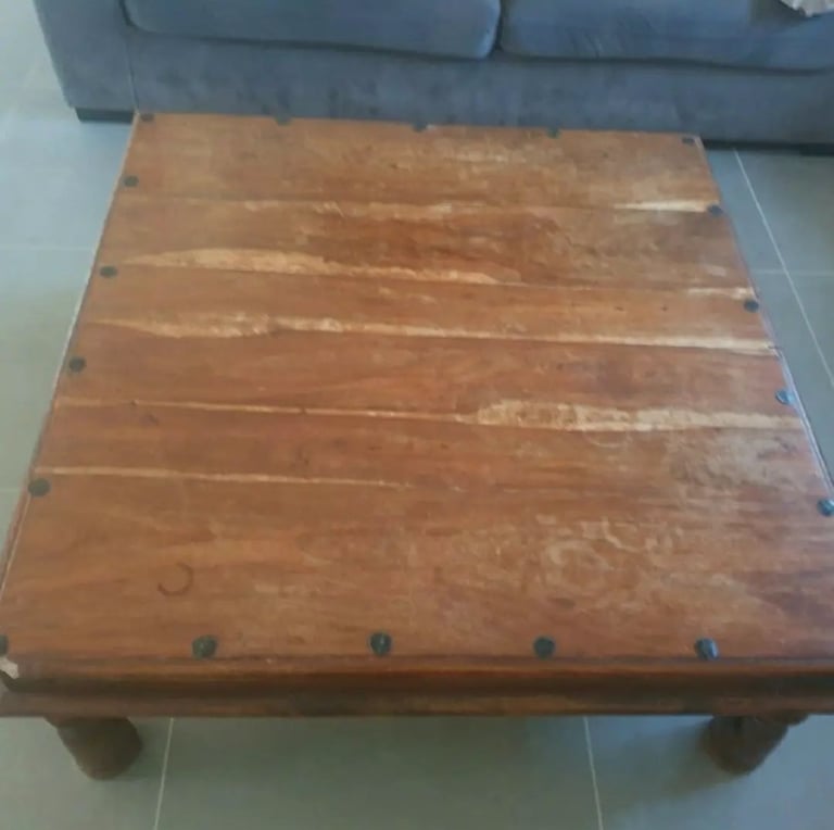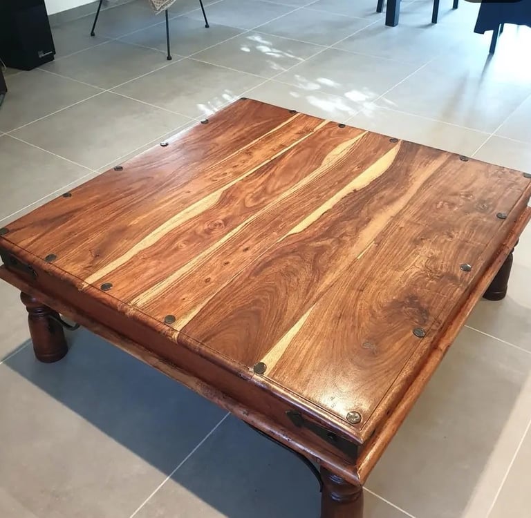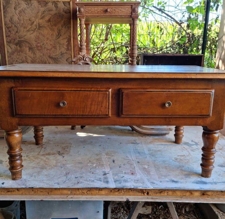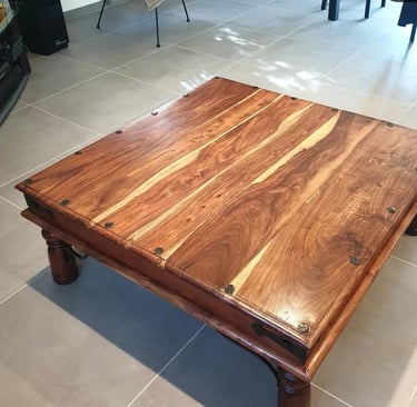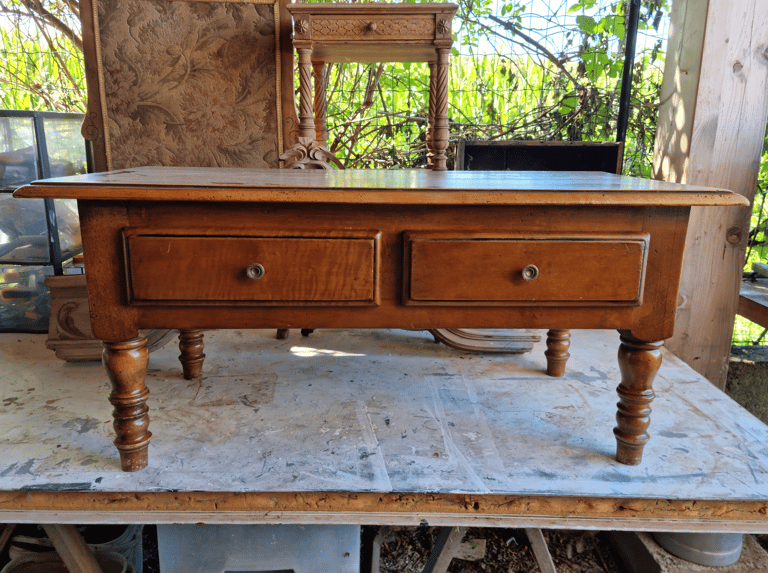 Table basse de salon restaurée, angle cassé refait, vernis de l'ensemble