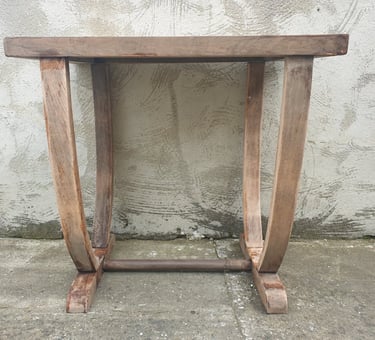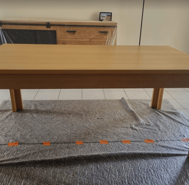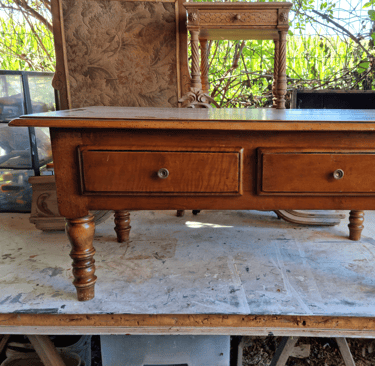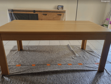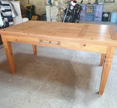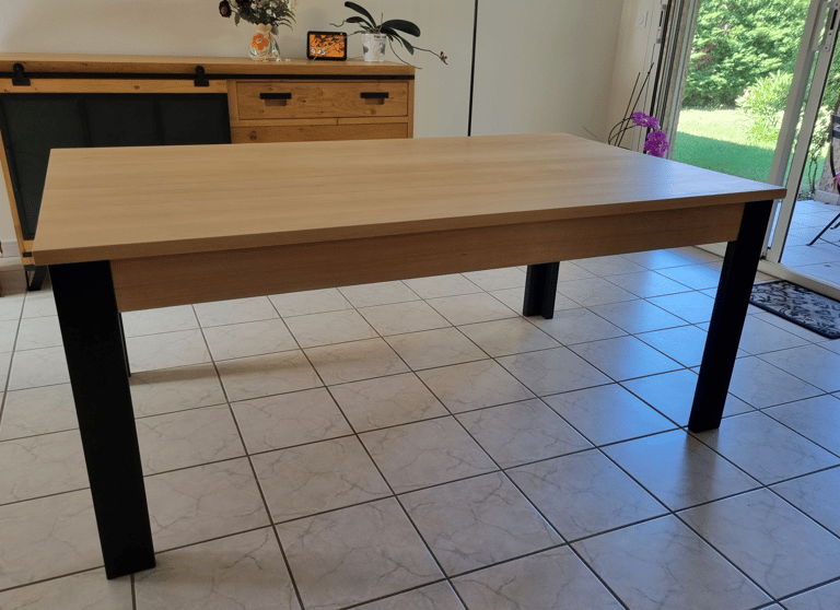 Table de salon poncée et vernis en ton naturel, les pieds ont été peint en noir mate