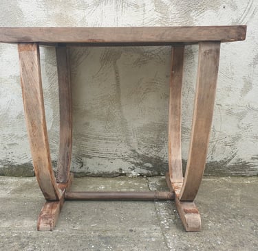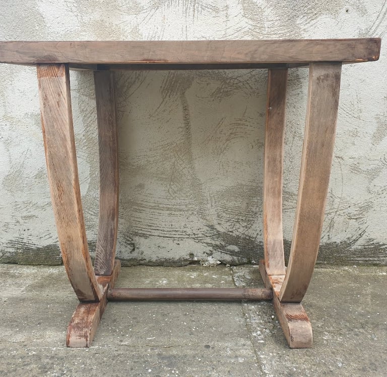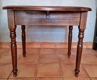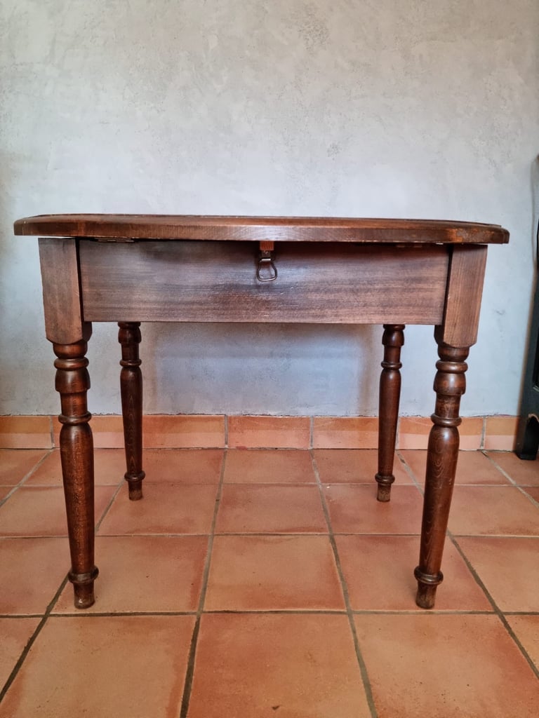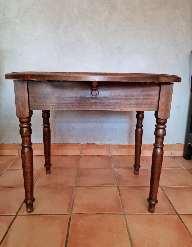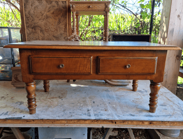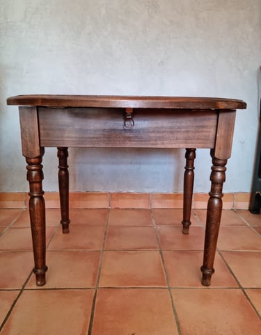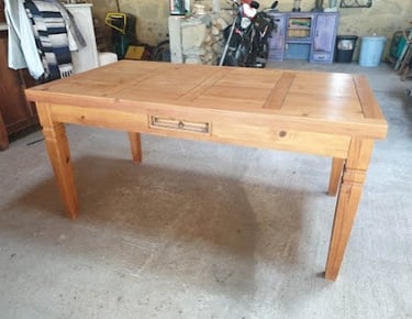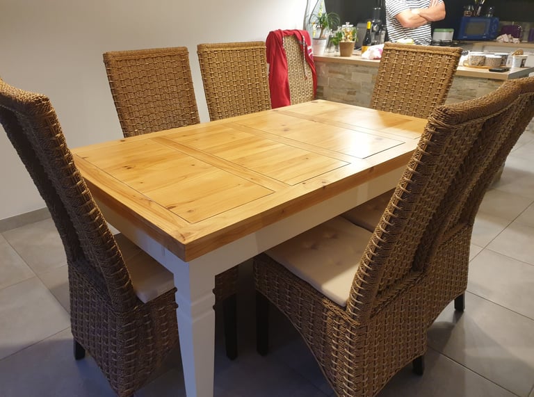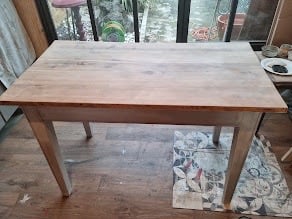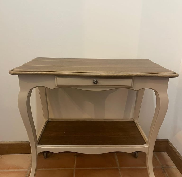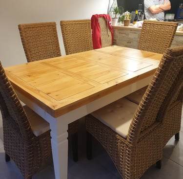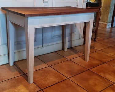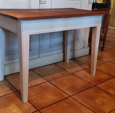 Vieille table abimée, restaurée, peinte en ton crème, le plateau a été teint couleur chêne et vernis