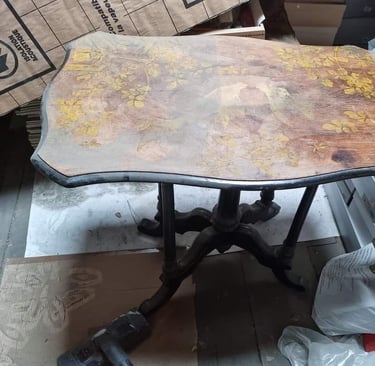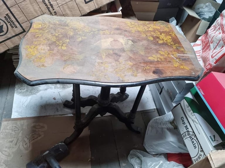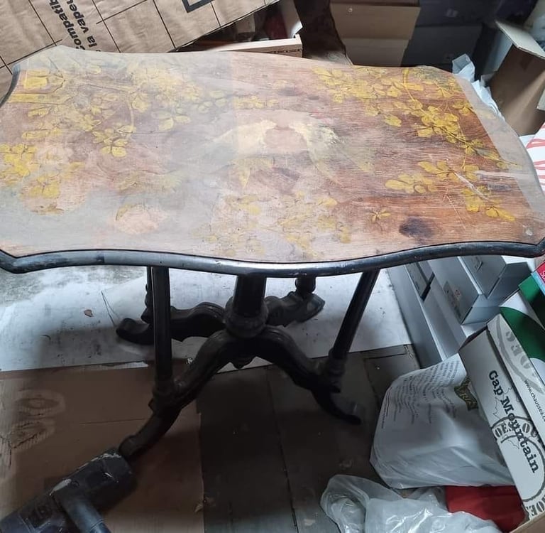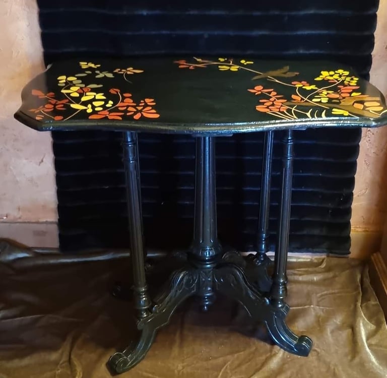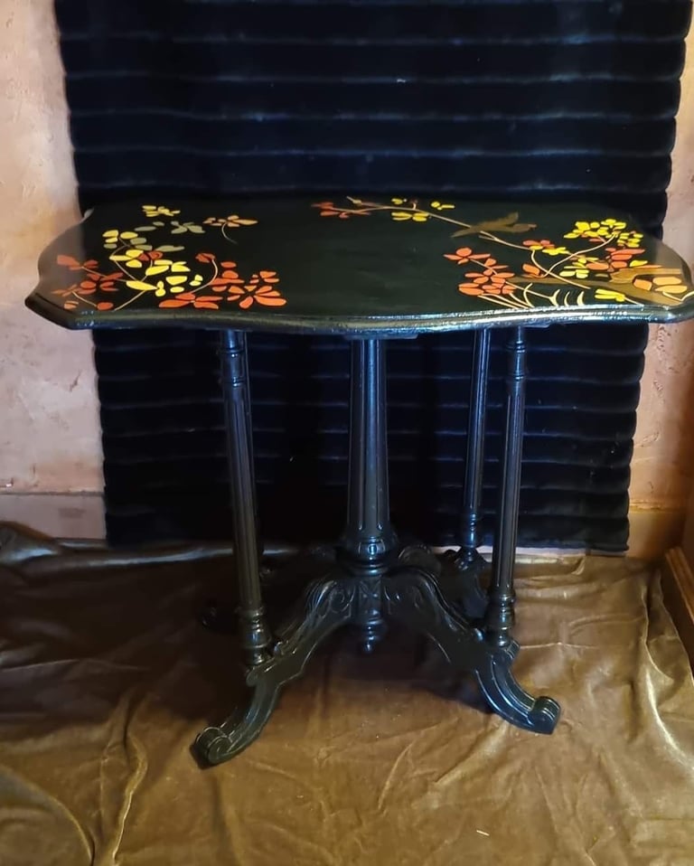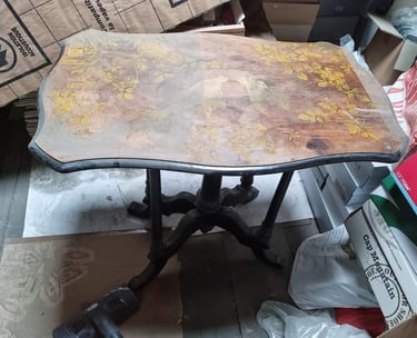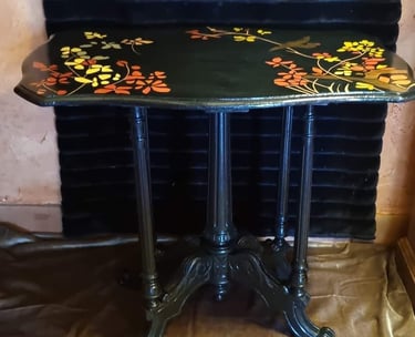 Vieille table décorée très abimée, restauration du placage, et reprise des dessins en peinture à la caséine. Les pieds ont été repeints en noir satiné