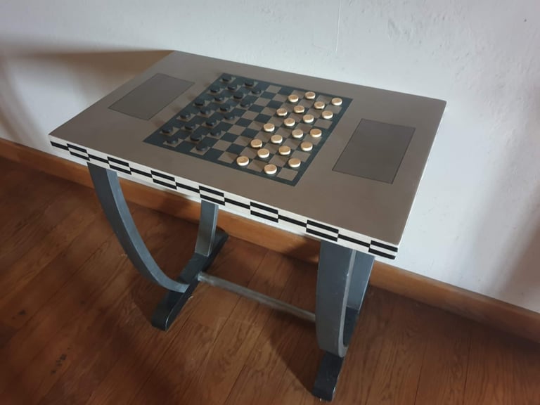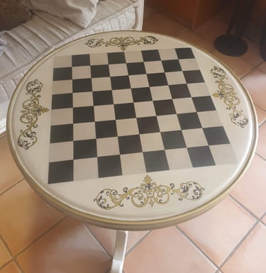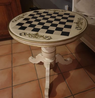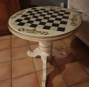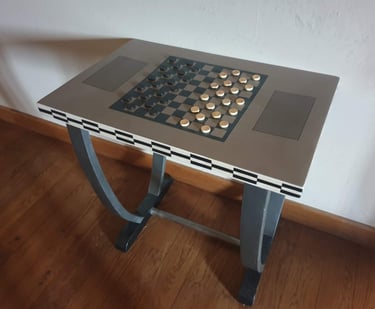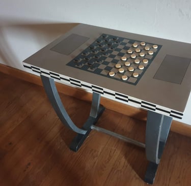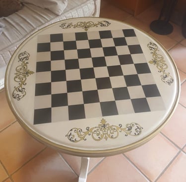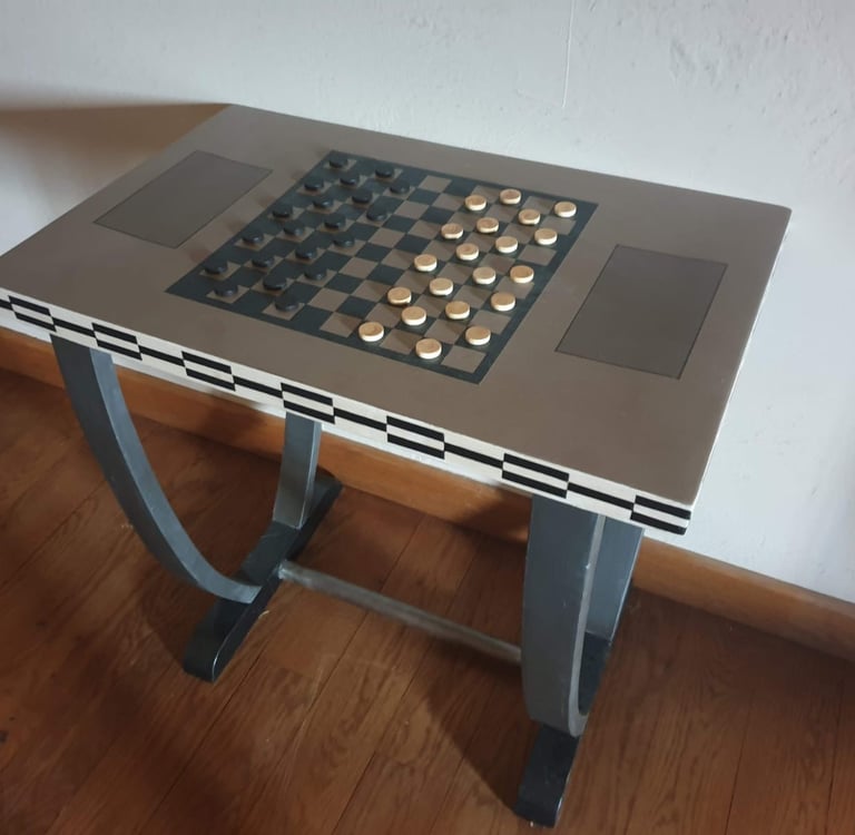 Table vintage, création d'un jeu de dames sur mesure, décors géométriques sur les côtés, les pieds ont été peints avec une métallisation à froid effet fer
