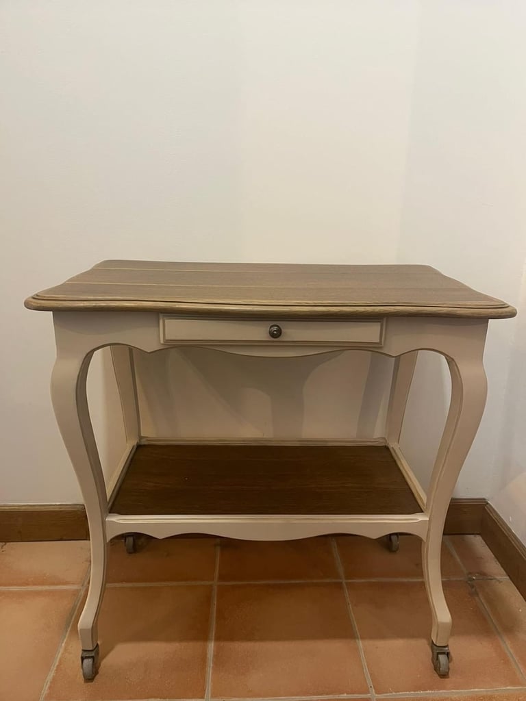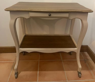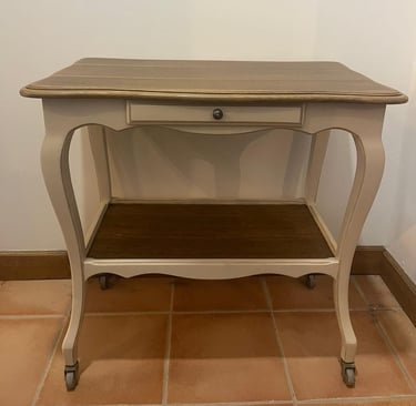 Table d'appoint sur roulettes, deux tons beiges, les deux plateaux ont été poncées et teint couleur chêne et vernis