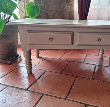 Table de salon peinte en blanc Aspen, le plateau a été poncé et vernis aspect naturel