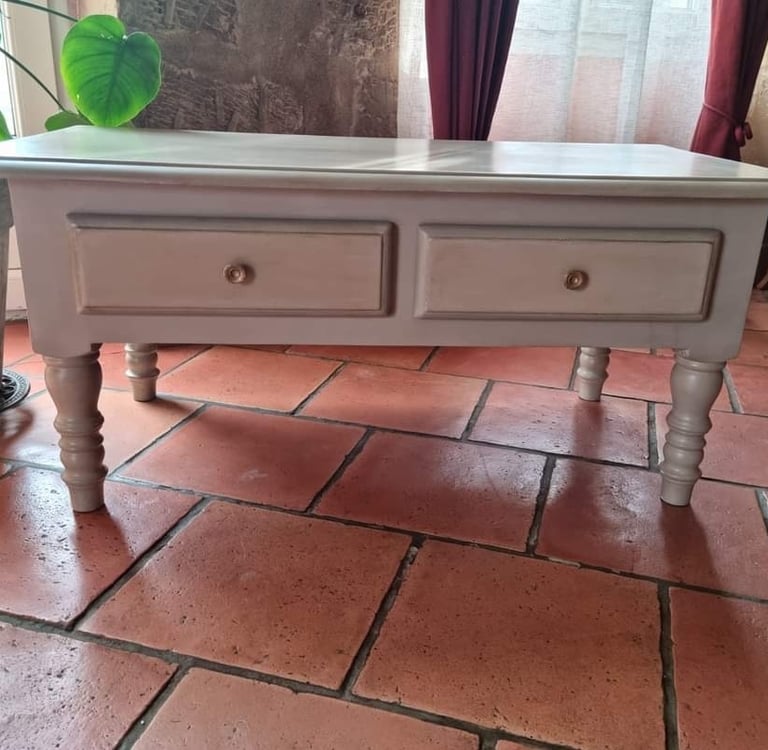 Table de salon peinte en beige et patiné en ombre naturelle