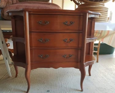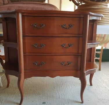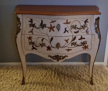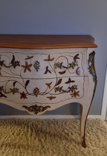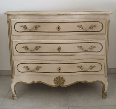 Commode style Louis XV rajeunie par une patine ombre naturelle, réchampis en peinture ton or