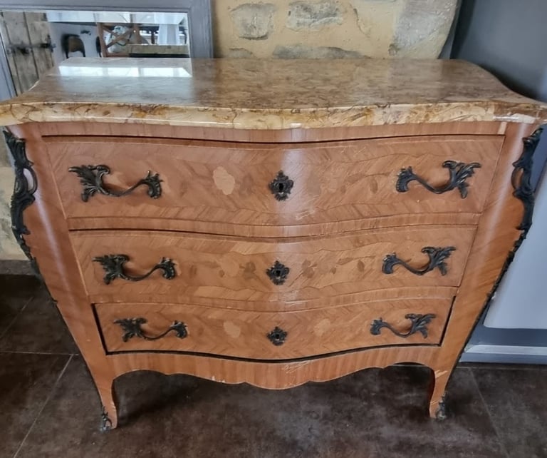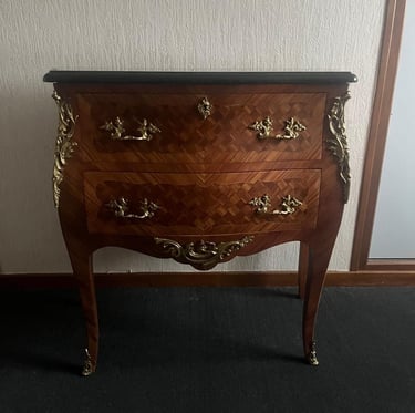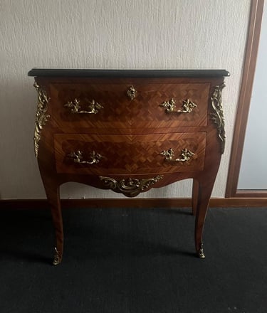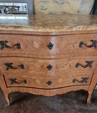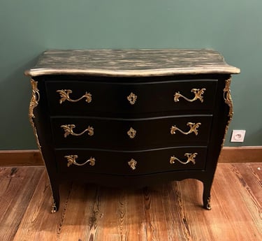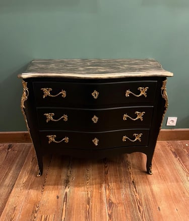 Commode, restauration et lissage du placage abimé, ton noir et or. Le marbre a été peint en noir mate et patiné en teinte or