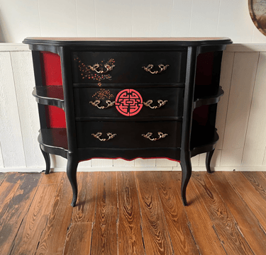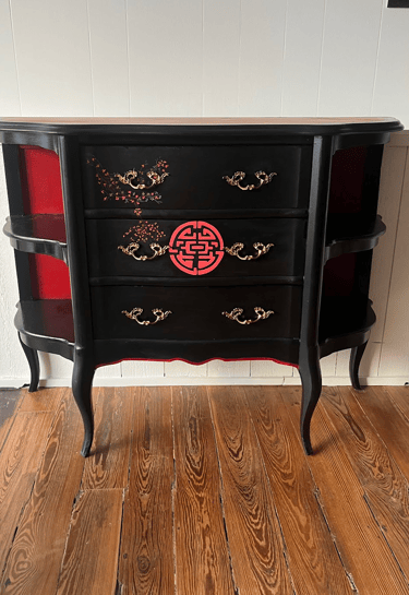 Commode à niches revisitée façon asiatique, dessins réalisés à la main. Tons noir et rouge